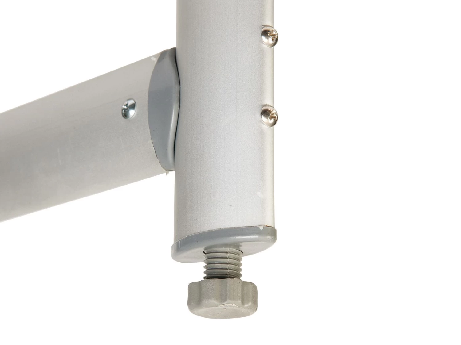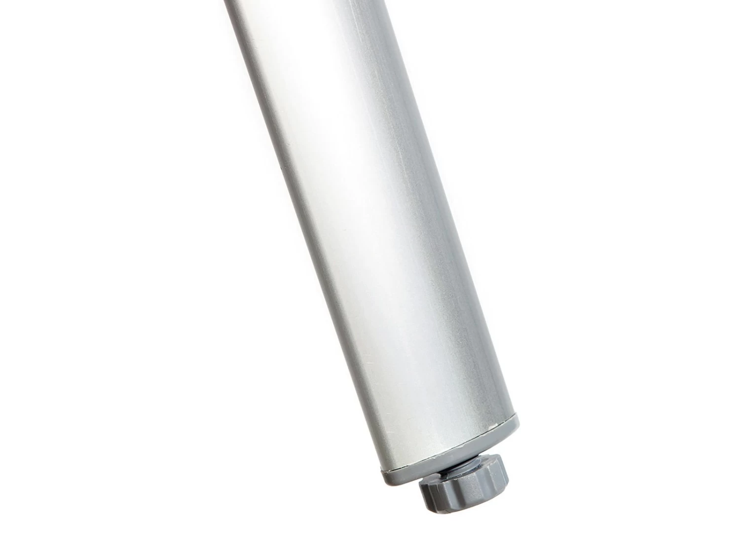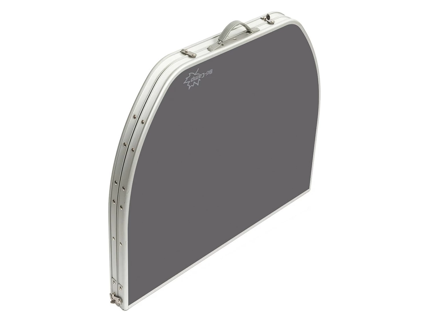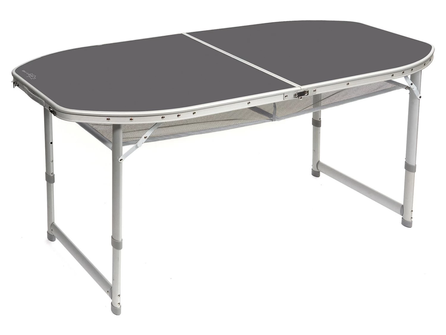 Dankzij het deelbare blad is deze ovale tafel in te klappen als koffer. De tafel is gemaakt van lichtgewicht aluminium met een MDF blad. Onder het tafelblad is een net bevestigd om spullen op te bergen.