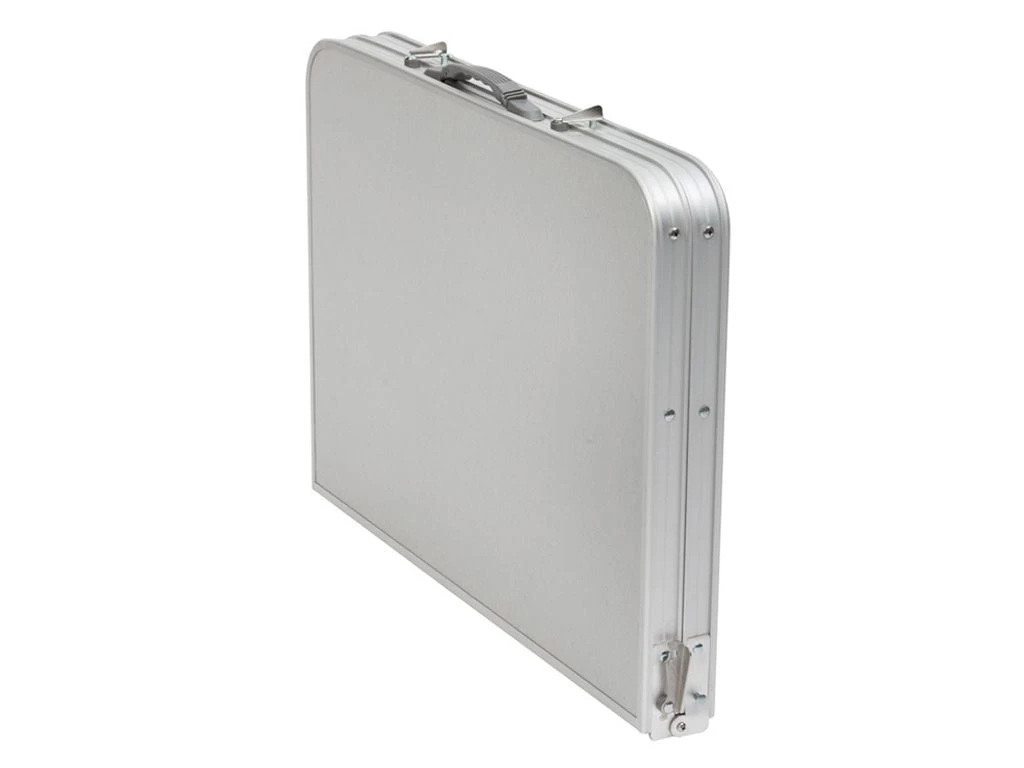 Deze aluminium tafel van Bo-Camp kun je eenvoudig mee nemen doordat hij is in te klappen tot een handig koffermodel. De tafel heeft uitgeklapt een afmeting van 120 x 60 cm en is verstelbaar in twee verschillende hoogtes, 36 en 70 cm. Alle vier de poten zijn voorzien van stelschroeven voor de fijnafstelling. Onder het blad zit een handig lectuurnet zodat je altijd je boek of tijdschrift in de buurt hebt.