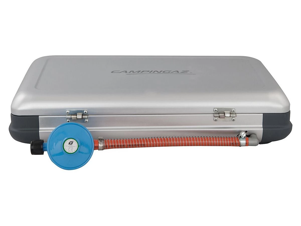 Wil je lekkere en grote maaltijden koken op de camping, maar niet een te groot en te zwaar kooktoestel mee nemen? Maak dan gebruik van dit kooktoestel van Campingaz, hij is voorzien van de Easy Clic PLUS-aansluiting waarmee je gascartouche in slechts enkele seconden aan kunt sluiten of los kunt koppelen. De slang en drukregelaar zijn inbegrepen. Koop er een CV470+ gascartouche bij en je kunt meteen een heerlijke maaltijd koken. Geen gedoe met grote gasflessen maar alles compact bij elkaar.