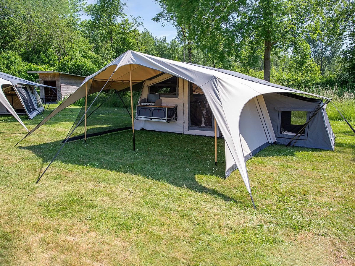 Een prachtige en karakteristieke zonneluifel van licht ripstop katoen met duurzame bamboestokken en dakliggers. De luifel kan uitgebreid worden met verschillende zijwanden.