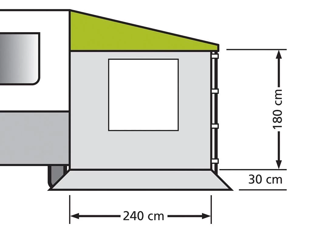 De Eurotrail universele zijwand 240 cm is geschikt voor aan de voortentluifel of caravanluifel. De zijwand is 240 cm diep, voorzien van een venster en is eenvoudig aan het luifelframe te bevestigen: aan de bovenkant met gespen om de dakligger, aan de voorkant met lusjes om de staander.