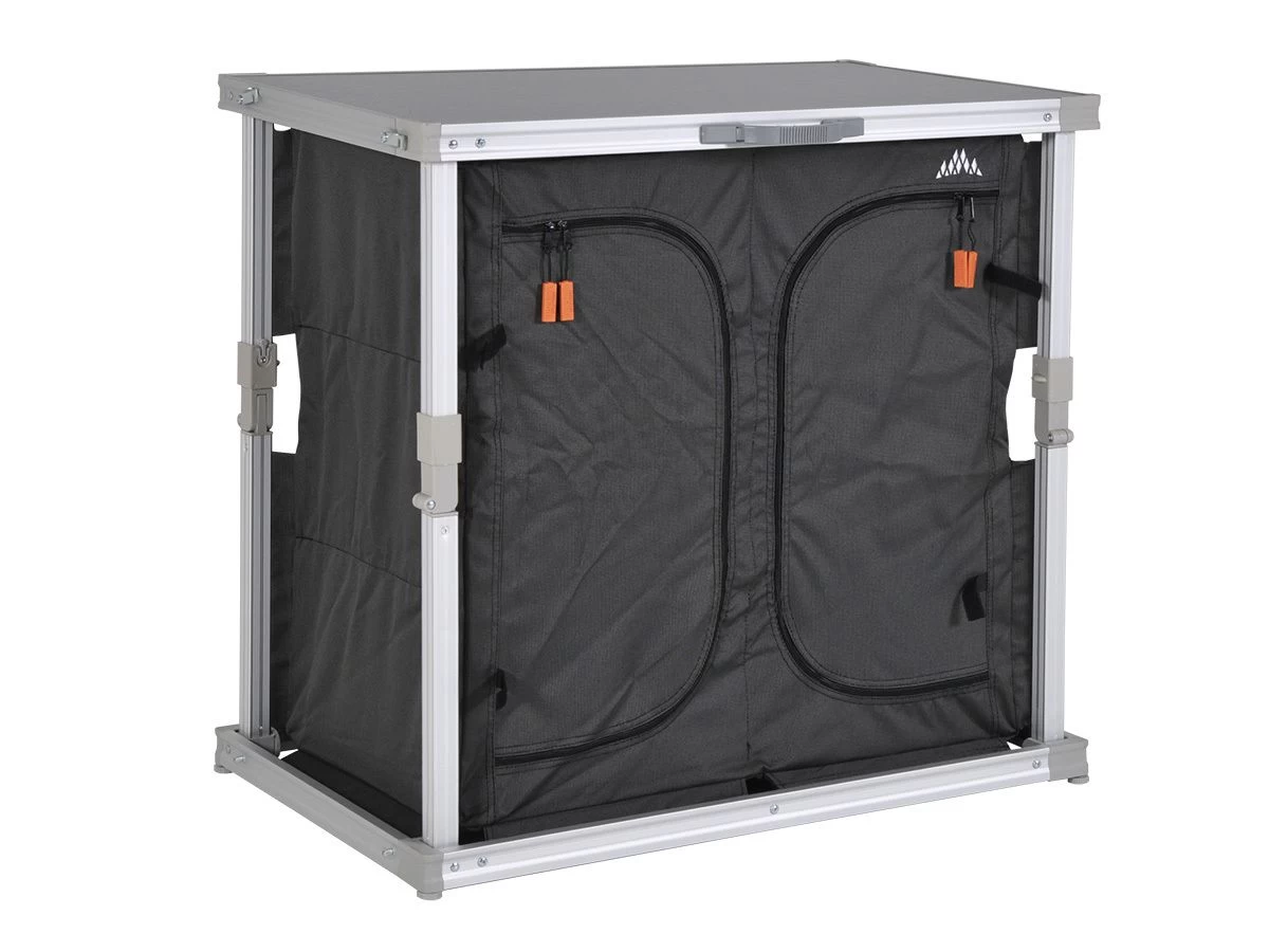 Deze campingkast heeft zes ruime opbergvakken waarin je jouw kampeeruitrusting overzichtelijk kunt opbergen. De achterzijde is voorzien van mesh gaas dat ervoor zorgt dat de kast goed geventileerd wordt.