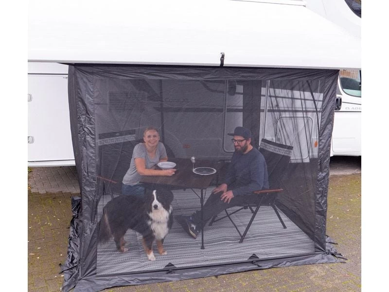 De Mosquito is een handige tent van horrengaas die je eenvoudig onder je luifel hangt. Haak de verstelbare spanbanden met clips achter de knikarmen van je cassetteluifel en zet de onderzijde vast met haringen. Beide zijwanden zijn voorzien van een oprolbare deur zodat je de luifeltent eenvoudig kunt betreden.