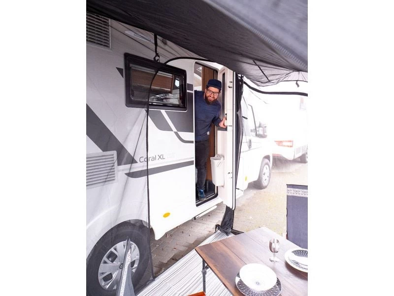De Obelink Mosquito wordt geleverd inclusief haringen en draagtas, en is passend voor cassetteluifels van merken als Thule Omnistor, Fiamma en Dometic Prostor.
