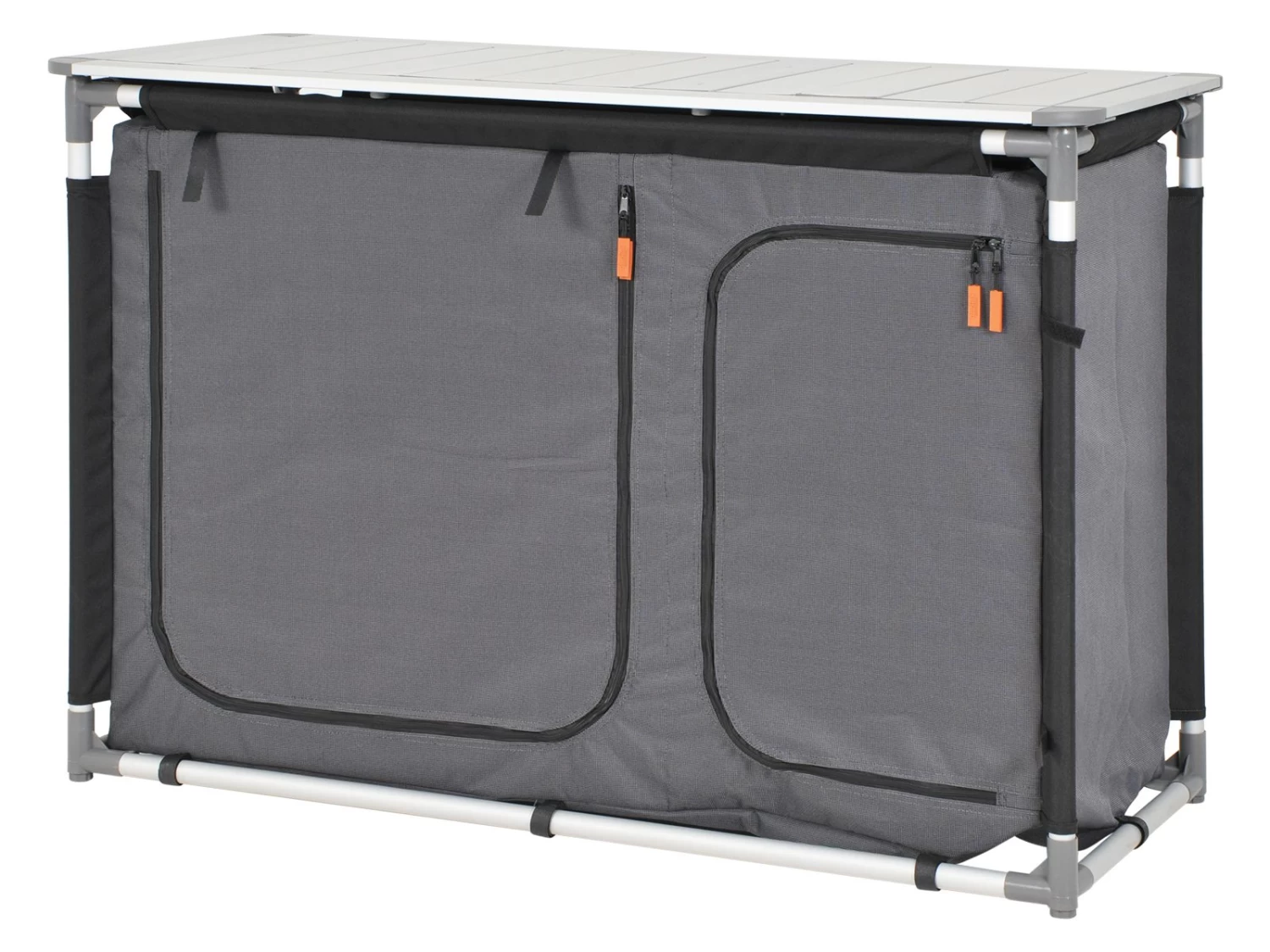 Deze campingkeuken is voorzien van 2 ruime opbergvakken, een speciaal vak voor een gasfles, een wasbak en een windscherm. Het windscherm is te gebruiken bij een kooktoestel met een maximale afmeting van 61 x 40 cm. Ideaal om een lekkere maaltijd te bereiden, de afwas te doen en alle kookbenodigdheden in op te bergen.