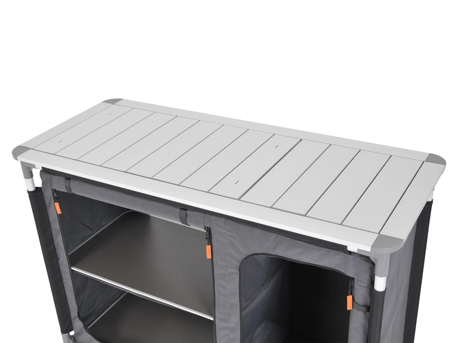 Wanneer je het wasbakje niet wilt gebruiken is hij dankzij het oprolbare bovenblad eenvoudig dicht te maken zodat je extra werkruimte creëert. Ook het windscherm kun je verwijderen van het bovenblad, zodat je deze campingkeuken ook als gewone campingkast kan gebruiken.