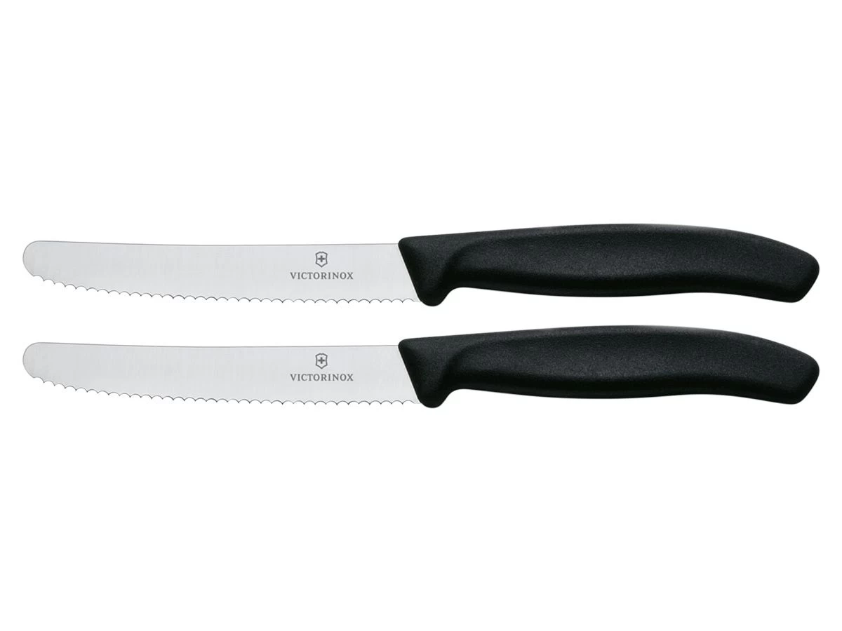 Een goed vlijmscherp gekarteld mesje hoort eigenlijk iedereen in de keuken te hebben. Super praktisch voor het snijden van bijvoorbeeld tomaten, blokjes kaas of harde worst. Deze tafelmessen hebben een 11 cm lang lemmet van RVS en een heft van polypropyleen.